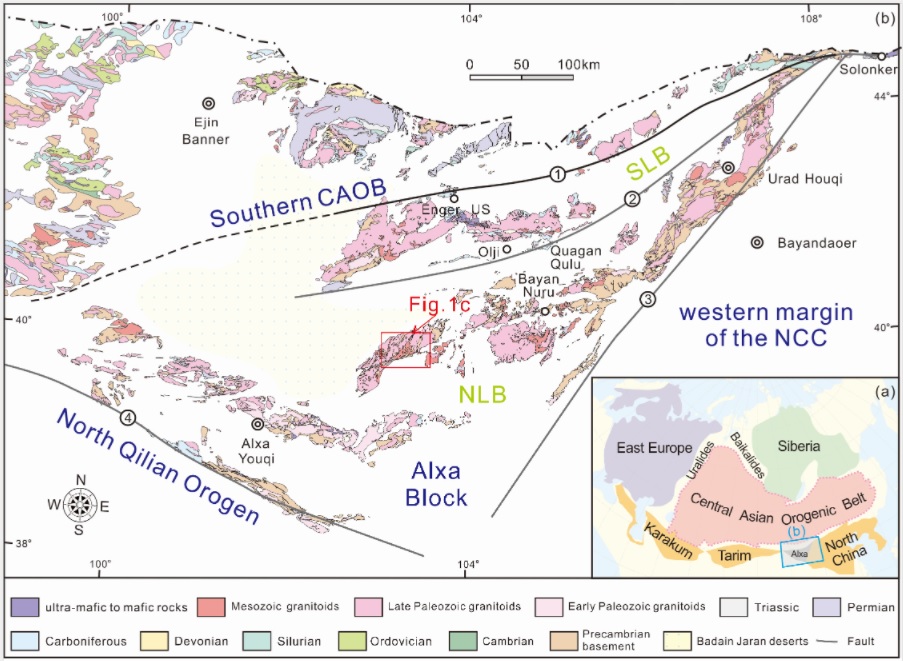 图1 (a)阿拉善地块及周边构造单元的简易概略图;(b)阿拉善地块及相邻构造单元的地质图