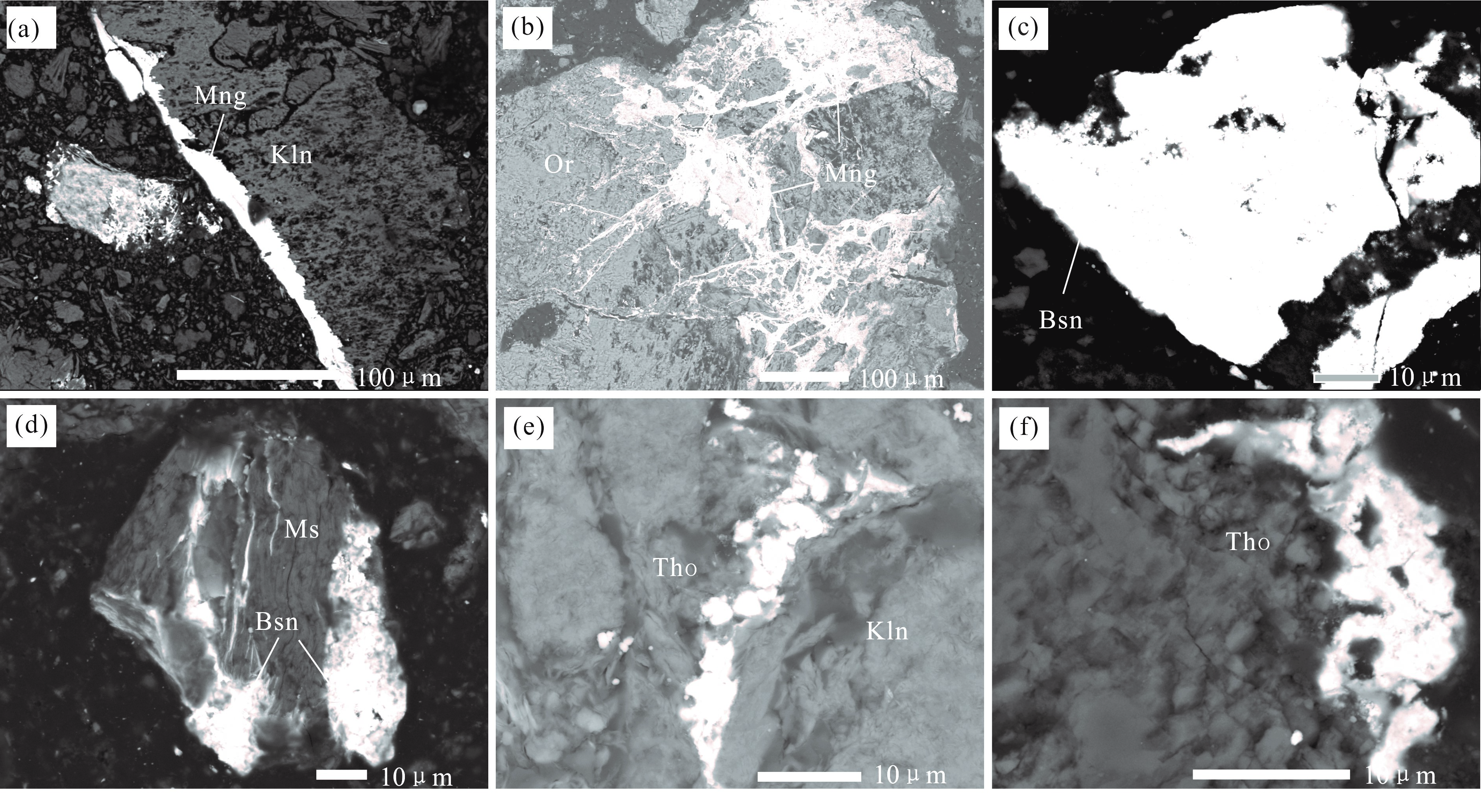 (a)—条带状铅锰铈矿沿高岭石边缘矿化,背散射图像;(b)—网脉状铅锰铈矿分布于正长石表面,背散射图像;(c)—粒状氟碳铈矿,背散射图像;(d)—氟碳铈矿沿白云母边缘矿化,背散射图像;(e)—粒状方钍石沿高岭石裂隙分布,背散射图像;(f)—不规则状方钍石沿高岭石边缘矿化,背散射图像;Mng—铅锰铈矿;Kln—高岭石;Or—正长石;Bsn—氟碳铈矿;Ms—白云母;Tho—方钍石