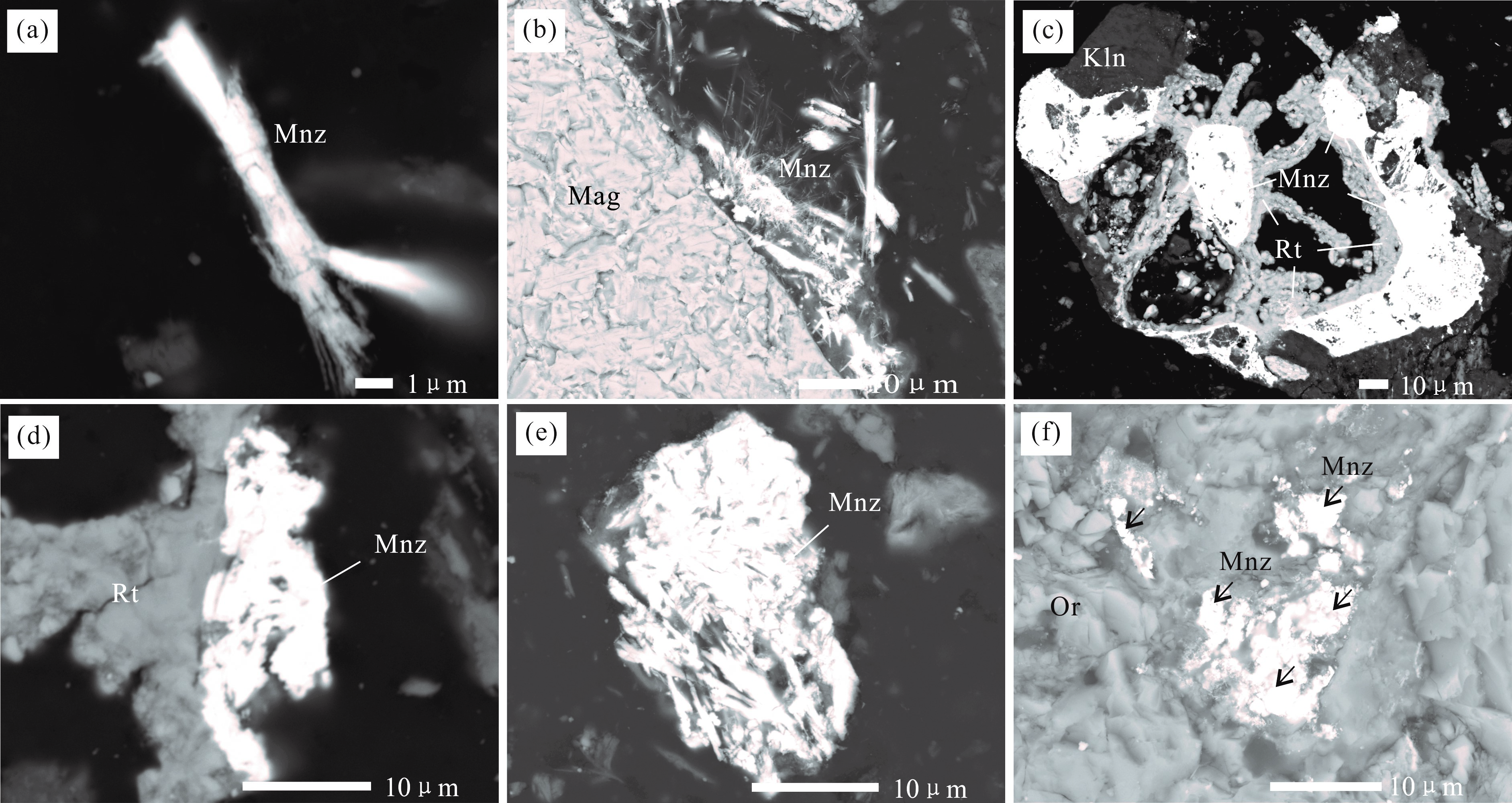 (a)—管状独居石,背散射图像; (b)—针状独居石,与磁铁矿共生,背散射图像;(c)—独居石与金红石、高岭石共生,背散射图像;(d)—独居石与金红石共生,背散射图像;(e)—粒状独居石,背散射图像;(f)—不规则状独居石分布于正长石裂隙中,背散射图像;Mnz—独居石;Mag—磁铁矿;Kln—高岭石;Rt—金红石;Or—正长石
