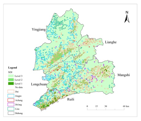 少数民族地区是我国经济社会发展区域框架的重要组成部分。由于缺乏相关的统计数据,已有研究大多集中在农村地区或少数民族的发展,研究对象没有细化到农村少数民族。本研究以云南省德宏傣族景颇族自治州为研究区域。运用地名数据精细化识别出五大少数民族地区,将夜光数据的亮度值作为区域发展的衡量标准,引入数字高程模型、净初级生产力、归一化植被指数和国内生产总值分别作为地形、气候、生态以及经济因子的评价指标,利用线性拟合和地理探测器测试因子并构建出可持续发展指标(SDI),定量分析每个少数民族的可持续发展能力。结果表明,德宏州五个主要少数民族中,傣族和景颇族具有较高的可持续发展能力,其次是阿昌族、傈僳族和德昂族。本研究的方法在评估民族聚落的发展中具有广泛的应用前景,研究结果对于德宏州五大少数民族的可持续发展具有一定的科学意义。