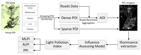 光污染是继废气、废水、废渣和噪声等污染之后的一种新的环境污染源,到目前为止,关于灯光污染的研究大多集中在国家、地区层面,鲜有涉及到其对人居环境的影响。本研究将夜光遥感影像和电子地图兴趣点(Point of interest,POI)相结合,提出一种道路限制进行同类POI聚类的方法,并利用灯光污染拟合函数对单点POI进行灯光污染拟合,对城市灯光污染情况进行分析,在此基础上对城市人居环境灯光污染情况展开评估。本研究以昆明、青岛两座城市为研究区,分析其城市夜间灯光污染的主要来源、污染程度,确定城市严重灯光污染区域及各类潜在污染源造成污染的比例。研究方法和结果可为城市规划、灯光使用方面提供一定的科学指导,以期改善城市光污染现状。