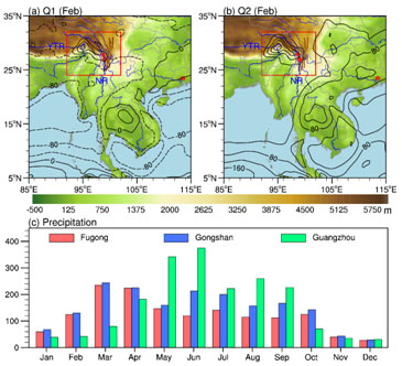 图2. 怒江流域“桃花汛”热源及逐月降水