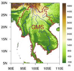 大湄公河次区域(GMS)包括中国云南省和中南半岛的所有国家。该区域作为亚洲地形最复杂的区域之一,气候特征十分复杂,是气候研究的热点和难点。区域内分布四条跨境河流:独龙-伊洛瓦底江、怒江-萨尔温江、澜沧江-湄公河和元江-红河(图1)。以往的研究表明,大湄公河次区域是典型的季风气候,东亚夏季风和印度夏季风在此交汇,5-10月为雨季。因此,大湄公河次区域的社会经济发展受到洪涝和干旱等环境问题的影响显著。例如,云南2009-2012年发生持续严重干旱,2015年末至2016年发生在大湄公河次区域南部的洪涝灾害,造成了严重的人员伤亡及经济损失。随着大湄公河次区域各国经济持续发展和全球变化大背景,旱涝灾害对大湄公河次区域社会经济发展及人类生存环境的影响进一步凸显。因此,各国政府及相关部门迫切希望能够掌握该区域气候变异的基本规律并提供可靠的气候预测,以便有针对性地采取灾害应对措施,做到主动预防。研究大湄公河次区域的降水异常不仅是科学问题,在防灾减灾上具有十分迫切的现实意义。