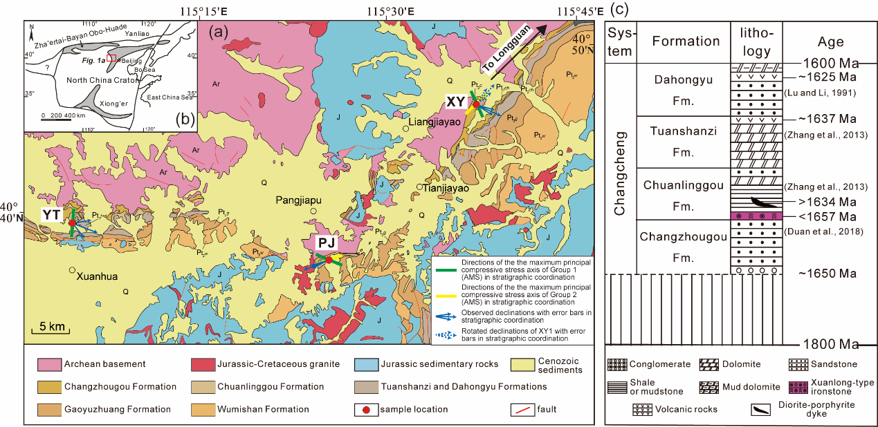2、古地磁学结果表明:从宣龙式铁矿中分离出的高温特征剩磁分量能通过C级倒转检验和褶皱检验,相应的古地磁极为50°N,193°E。该古地磁极位置与华北南缘同期崔庄组(~16.4亿年)的古地磁极结果相近。结合显微镜下分析和岩石磁学分析结果,该特征剩磁被解释为原生剩磁,并为早期成岩作用中沉淀的含铝赤铁矿所携带的化学剩磁。古地磁学研究结果肯定了含铝赤铁矿是宣龙式铁矿的原生矿物,也确定了宣龙式铁矿的成矿时代为古元古代晚期。