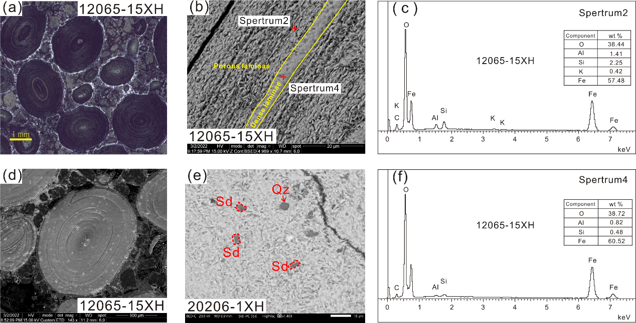 3、通过解析含铝赤铁矿的携磁机制、铁质鲕粒和叠层石的生长过程,宣龙式铁矿中铁质鲕粒和铁质叠层石中致密层或疏松层赤铁矿的发育过程实际上就是沉积物孔隙水化学成分的变化过程,反映的是宣龙式铁矿沉积区处于海陆过渡带特殊位置的海平面相对高度变化。当相对海平面上升时,沉积物中孔隙水以海底热液输入的水体占主体,发育致密层,而当相对海平面下降时,沉积物中孔隙水以径流输入的水体占主体,发育疏松纹层。