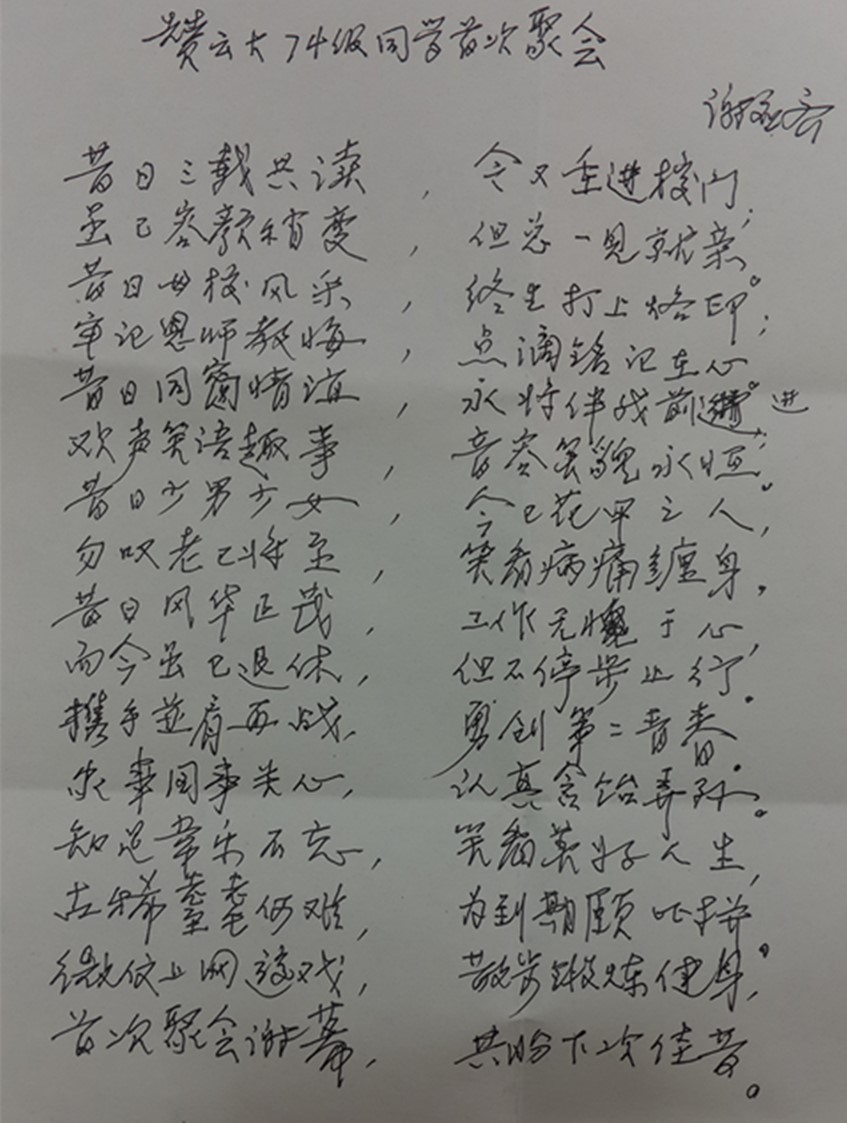在为国家工作三、四十年后,74级员工们都已退休,几位老教授勉励员工们知足常乐,安度晚年。来自西藏的员工为老师们献上洁白的哈达,祝福老师们健康幸福,也祝愿公司发展日新月异,将聚会的欢乐气氛推向高潮。最后谢应齐教授为大家朗诵了特意为此次聚会所做的诗歌,成为此次聚会的点睛之笔。