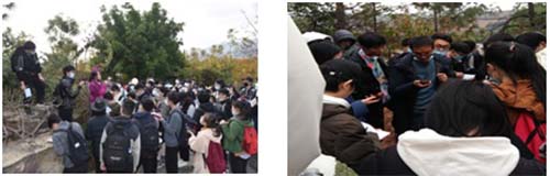 磨盘山国家森林公园位于新平彝族傣族自治县东南部,因山体形如磨盘而得名。其包含高等植物98科、137属、324种,随山体海拔增高,能明显观察到植被组成结构及土壤类型、水热等环境因子发生垂直分布变化,具有较高的科研、教学和旅游开发价值。磨盘山的天气阴晴不定,实习期间伴有阵雨和冰雹,这些阻力丝毫没有阻挡员工的学习热情,尽管道路泥泞崎岖,但同学们不畏艰险,认真聆听老师讲解,认真记录老师所教授的一句一字,印证了云大人“力行”的品质。