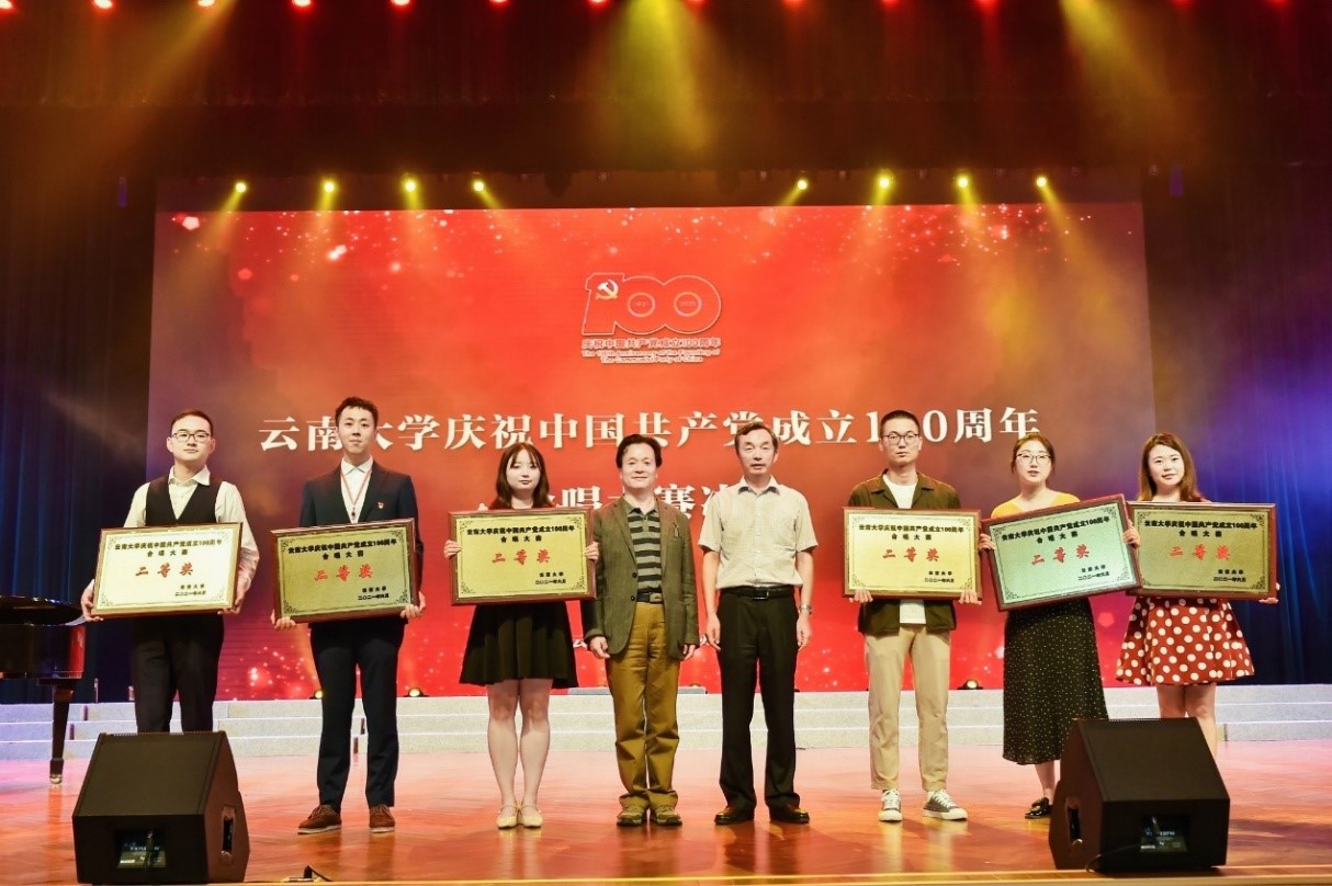 经评审,最终本院师生所献唱的《唱支山歌给党听》荣获二等奖,院团委书记唐薇代表公司上台领奖。