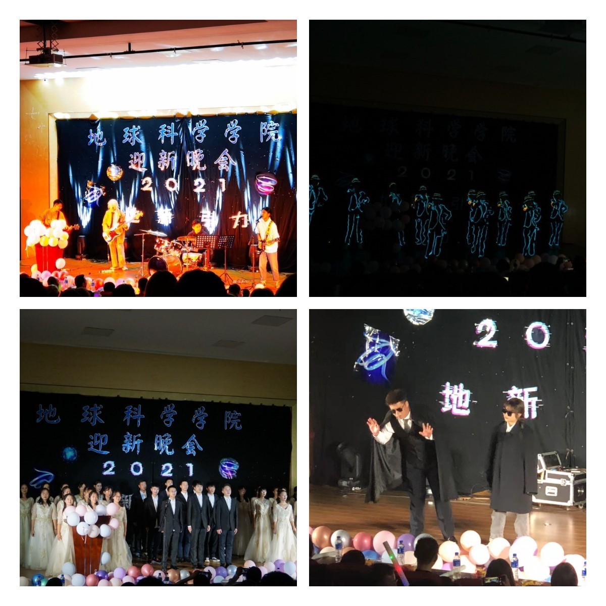 本次晚会内容丰富,翩翩起舞的佳人,既可“一肌一容,尽态极妍”,又可热情似火,充满活力,直教人大饱眼福!一首《想去海边》与一首《无双》,其动感的鼓点,激昂的歌声,将观众的热情在一瞬间点燃,代表着年轻地学人对美好未来的渴望与不懈追求!小品《不负青春债》则以校园贷为背景,生动地讲述了同学深陷校园贷困境并在人民警察的帮助下最终得到解救的故事,让同学们提高了警惕意识,为防范校园贷陷阱打了一剂预防针。如夏花般灿烂绽放,舞蹈《Sunny Summer》以生命演绎夏天,以青春点燃热情,激起年轻地学人的一次又一次狂欢。如黑暗中不懈燃烧着的倔强,荧光舞《十二小天鹅》在光影闪烁之间展现着从胆怯丑小鸭到自信小天鹅的华丽转变,激情与活力所展现出的生命光彩再次引爆全场的情绪共鸣。最后的大合唱《夜空中最亮的星》,近百人嘹亮的歌声如点点繁星般点亮了整个报告厅,或许,当迎新晚会落幕,当多年后所有人再次抬头仰望星空,总会发现有那么一颗星星,一直在以自己独特的光芒,指引前进的道路。“声“入人心,愿每个人都能找到自己最亮的那颗星!