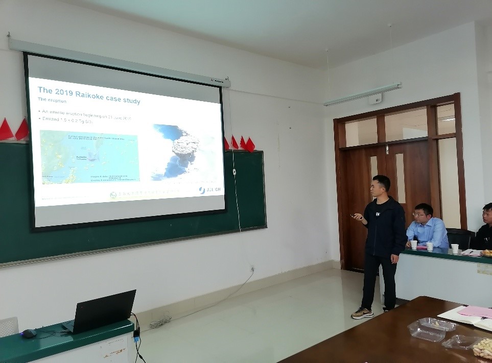 蔡忠银介绍了火山二氧化硫排放的危害,并以2019年Raikoke火山事件为例,通过卫星观测数据的收集以及拉格朗日模拟,建立了火山二氧化硫排放的重建模型。同与会人员分享了他的最新研究成果。