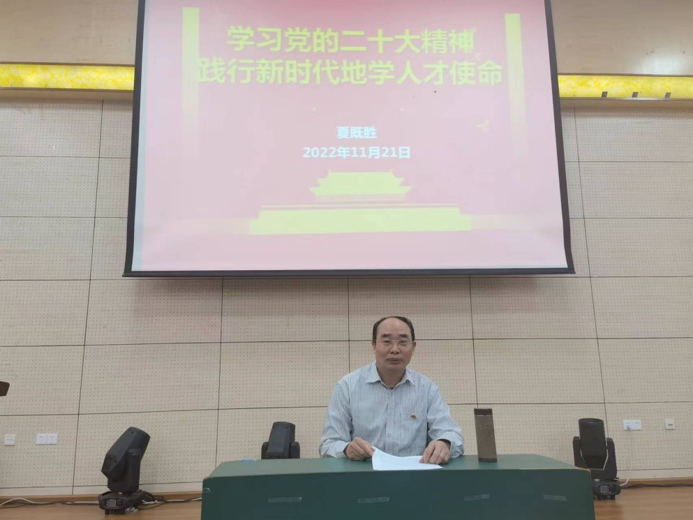 夏既胜作了题为《学习党的二十大精神 践行新时代地学人才使命》的宣讲,就二十大报告内容,特别是报告中关于加快建设高质量教育体系的相关内容进行了详细的解读。最后,夏既胜围绕涵有信仰力、育有“眼力”、葆有“脚力”三个方向对广大党员同志彰显担当作为、践行初心使命提出了要求。