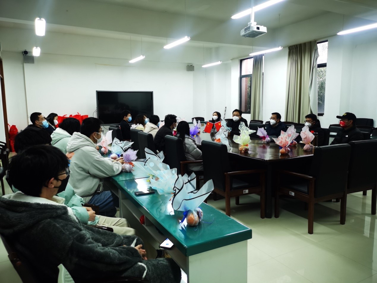 刘恒向同学们表达了关爱,询问同学们受新冠病毒感染的情况,送上对同学们的新春祝福,并强调留校期间如有困难,可以联系辅导员、联系公司。赵志芳在叮嘱同学们努力完成学业任务的同时,也祝福同学们在新的一年里都能实现自己的学习目标。陈俊旭结合自己读书时的经历,分享了如何充实假期,鼓励同学们合理的利用假期。周家喜从专业的角度给正在准备考研的同学分享了学科交叉的学习方法和建议。韩雪向留校的同学们送上了新春祝福,给每位同学发放了苹果和橙子,并借此祝福同学们平安喜乐,学业有成。