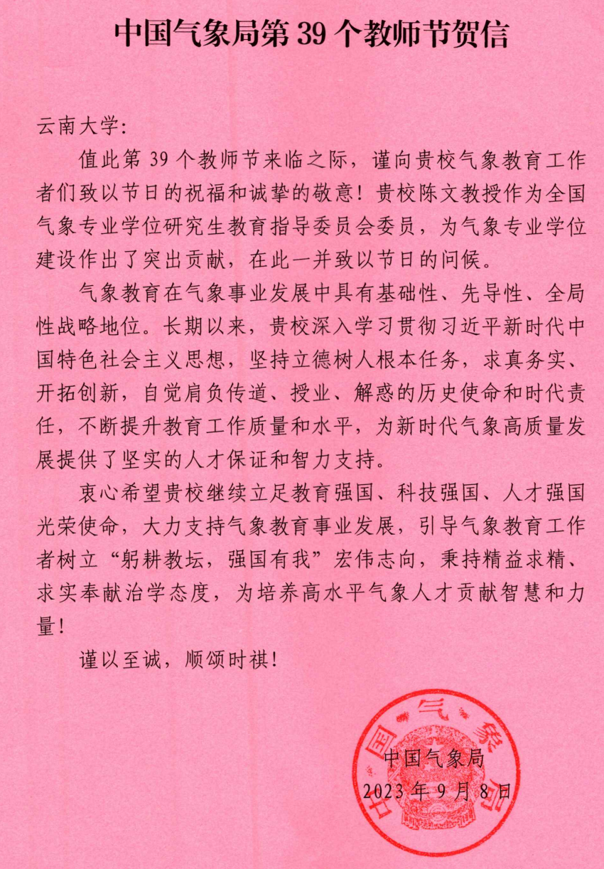 在2023年第39个教师节来临之际,中国气象局向伟德bv1946发来贺信,向伟德bv1946气象教育工作者们致以节日的祝福和诚挚的敬意,陈文教授作为全国气象专业学位研究生教育指导委员会委员,为气象专业学位建设作出了突出贡献,一并致以节日问候。