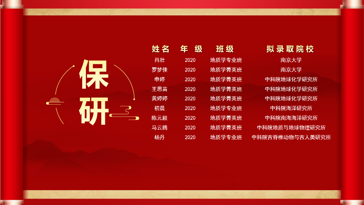 随着2023年保研结果的公布,我系2020级地质学专业员工捷报频传,终圆保研梦。9名获得保研资格的员工均成功保送到心仪的单位,分别被南京大学和中国科公司等国内著名院校录取。