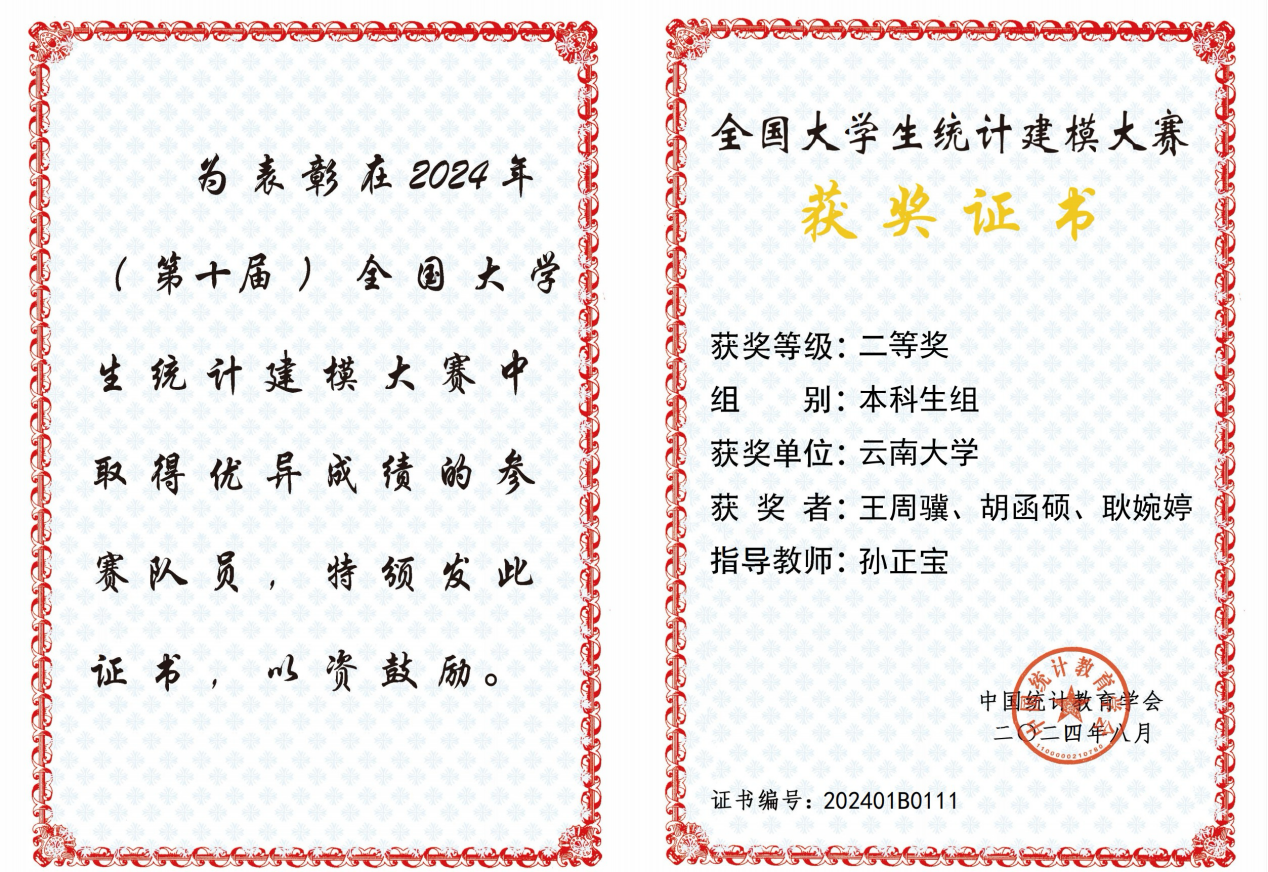 8月21至23日,由中国统计教育学会主办的第十届全国老员工统计建模大赛全国总决赛在西安财经大学举行。2021级本科生王周骥、胡函硕和耿婉婷三位同学组成的参赛队伍经过校赛、省赛、国赛通讯评审和会议评审的激烈角逐,入围全国总决赛。参赛队伍以“云贵川地区干旱时空分布的预测与评估——基于EOF-CNN 预测模型”为题进行现场答辩,并荣获本科生组全国二等奖佳绩,刷新公司在该项赛事中的历史最佳成绩。地理科学系教师孙正宝全程指导参赛队伍,并荣获优秀指导教师奖。