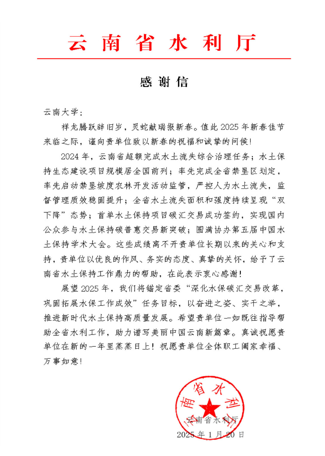 云南省水利厅在感谢信中表示:2024年,云南省在水土保持领域取得了显著成绩,超额完成水土流失综合治理任务,水土保持生态建设项目规模居全国前列,率先完成全省禁垦区划定并启动禁垦坡度农林开发活动监管,全省水土流失面积和强度持续呈现“双下降”态势。此外,云南省首单水土保持项目碳汇交易成功签约,实现了国内公众参与水土保持碳普惠交易的新突破,并圆满协办第五届中国水土保持学术大会。这些成绩的取得离不开伟德bv1946长期以来的关心与支持。