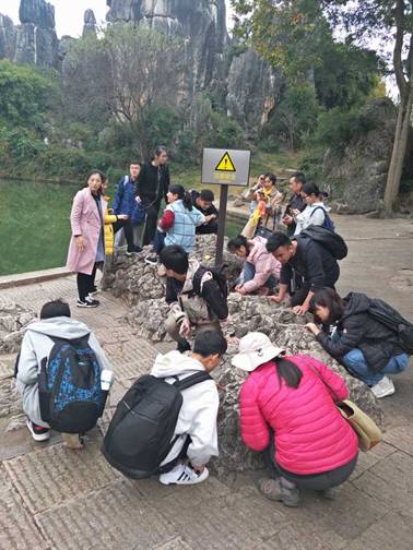 本次实习的开始,老师向同学们讲解了喀斯特地貌的特点以及石林形成的地质背景,然后提出了本次实习的问题,带着问题所有同学分为几个小组,同学之间互相帮助以确保每个同学都不掉队,体现了我们资环人的团结无畏。实习过程中,同学由老师指导教学,参观实习石林各种喀斯特地貌,从微观的生物碎屑,到宏观的峰林,收获满满,感慨于大自然的鬼斧神工!