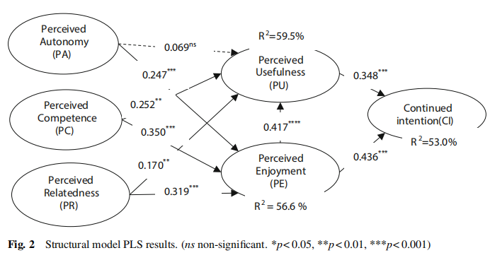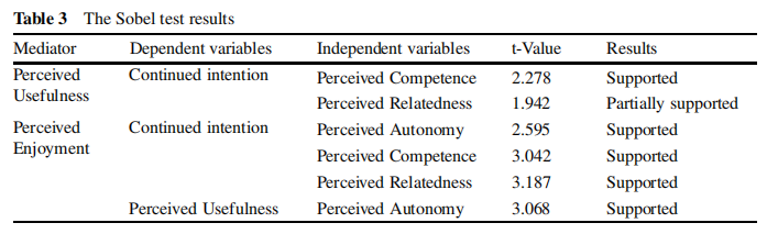 为了支持H7,感知有用性与在线自我调节学习(SRL)的持续意图相关(β=0.348,p<0.001)。感知享受与在线SRL(β=0.436,p<0.001)和感知有用性(β=0.417,p<0.001)的持续意图相关,分别支持H8和H9。使用Sobel检验进一步检验了感知有用性和感知享受的中介作用。如表3所示,结果显示了三种基本心理需求通过感知有用性和感知享受与持续意图之间的间接关系。特别是感知能力与感知的关联和持续意图之间的间接关系显著;三个基本心理需求与持续意图之间的间接关联显著;感知的自主性和感知的有用性之间的间接联系是显著的。