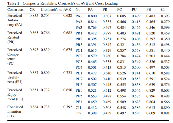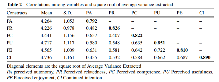 如表2所示,判别效度得到了证实。上述证据表明,在本研究模型中,所有结构都具有可接受的心理测量特性。