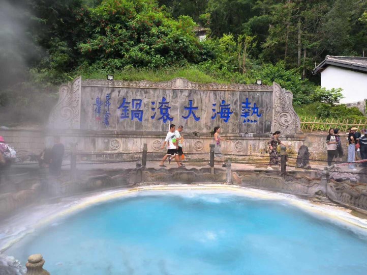 攀登最后,到达至高点:“天下第一汤”,碧蓝的泉水裹挟白浪向上腾起,水温更非其他泉眼者可比。经查阅,泉水的化学成分是研究分析的主要对象,根据聚类分析可分为A类(主要矿物成分,含Cl,K,B,F,As),B 类包括Ca,Mg,Sr和SO42-四个组分。其中大滚锅湛蓝若此,得益于显色元素Cs(铯)。