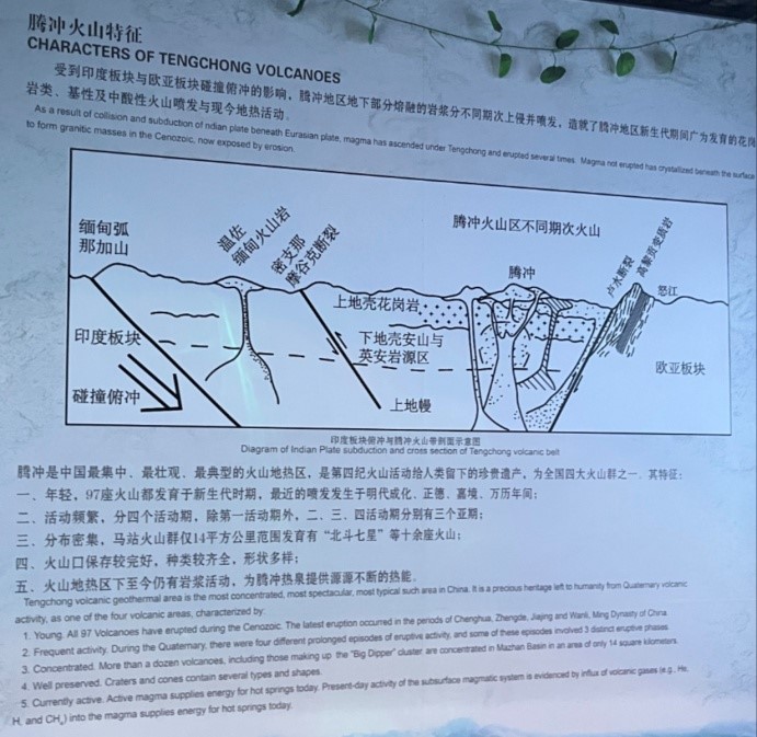 首先到达的是博物馆,据馆中资料与老师讲解:腾冲热海区是我国大陆地区罕见的确认与近代火山有直接成因联系的高温地热区,拥有火山90多座其中23座火山口保存有良好形态:有截顶圆锥状火山,低平状火山,盾状火山.......这些火山距今约有2.58亿年,为休眠火山,地壳下有未喷发的岩浆。腾冲地处欧亚大陆板块与印度大陆板块碰撞带附近,地壳厚度较薄,岩浆活动和地震频繁,条件决定岩浆更易侵入乃至喷出地表形成火山爆发。