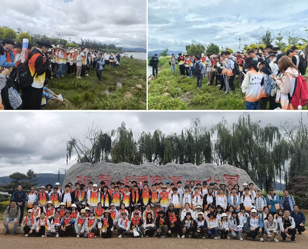 在杞麓湖,黄玥老师带领同学们实地踏勘,为同学们讲解农田-湿地-湖泊水循环过程和湖泊治理相关知识。