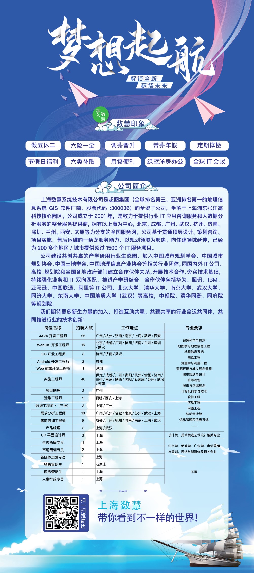 331日,公司副经理陈俊旭带领地理科学系积极为毕业生寻找专业对口企业,特邀上海数慧系统技术有限公司到公司做专场招聘,提供相关专业岗位近百个,地理科学系组织毕业生积极参加。有意向可扫下面的二维码投递简历。
