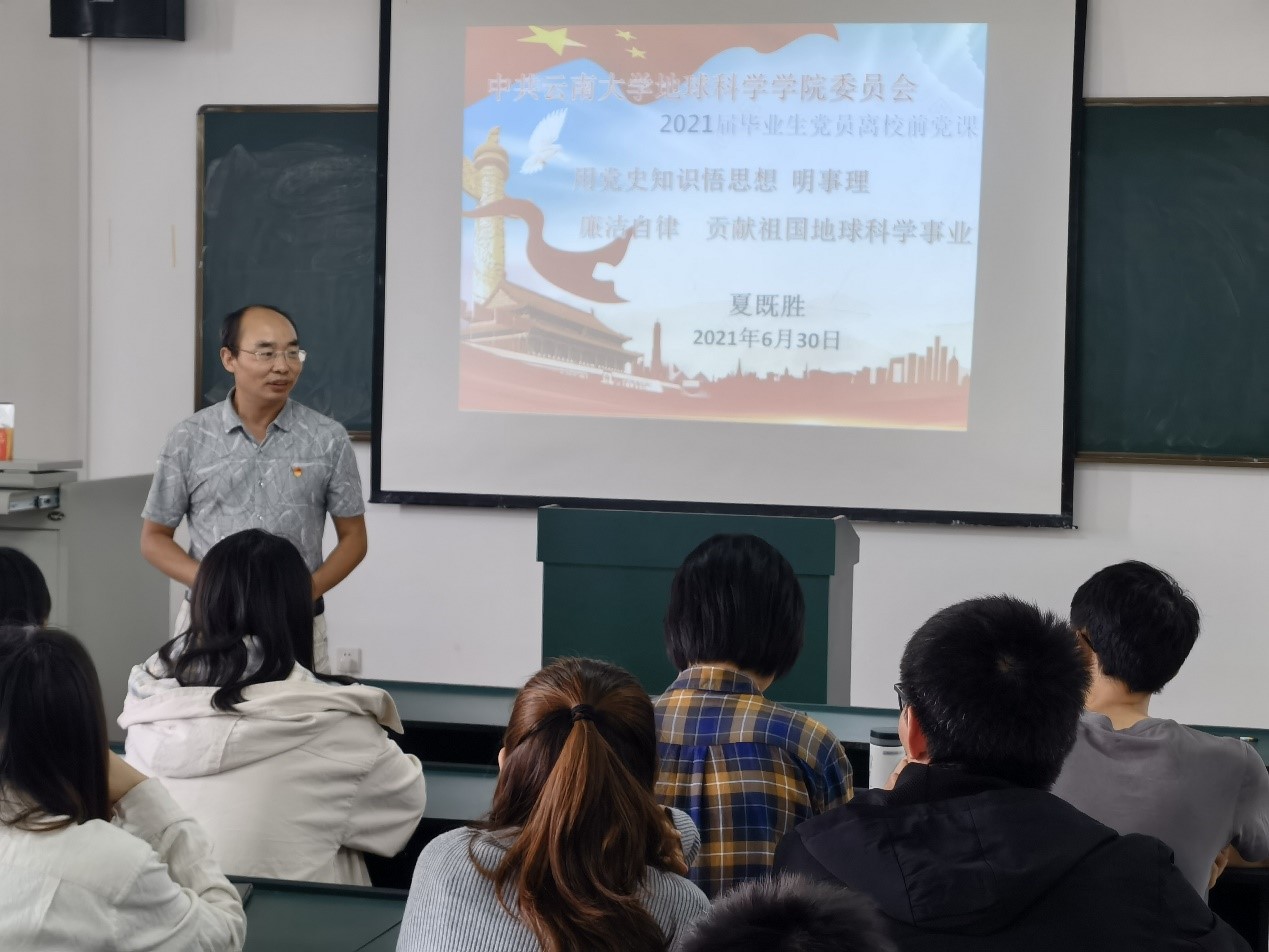 夏既胜书记从三个方面为同学们分别进行讲解。他提出,毕业在即,希望大家能够不忘初心,牢记使命,延续红色基因;其次,大家马上要褪去稚气,进入社会,希望在未来的工作、学习中,能够进一步夯实专业基础,锻炼技能,争做地学精英;最后,夏老师提出,希望同学们在今后的工作中能够防微杜渐,坚守自身廉洁底线。
