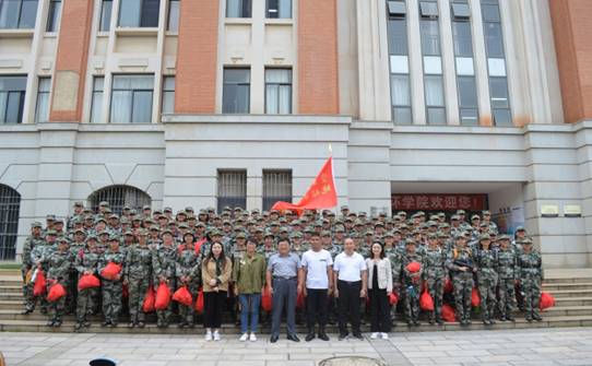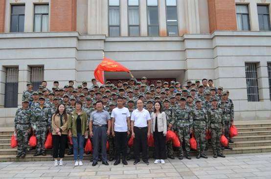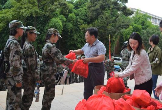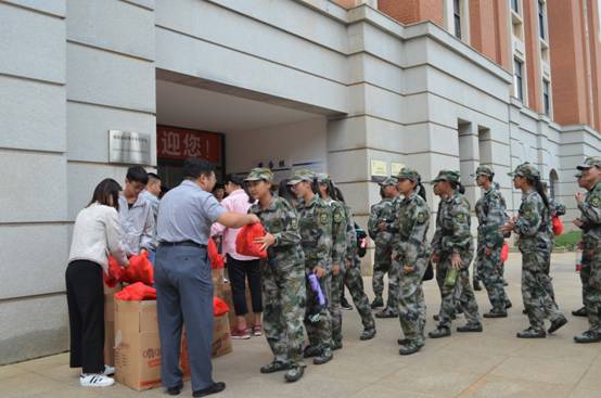 慰问活动开始,经理谈树成老师代表公司发言,对新生表示慰问。两个星期的训练临近尾声,军训的效果显而易见,新生们的一举一动已然有了些军人的英姿飒爽。他们在公司门口排成整齐的队伍,以挺拔的军姿站立,井然有序地从老师们手里领取慰问品。