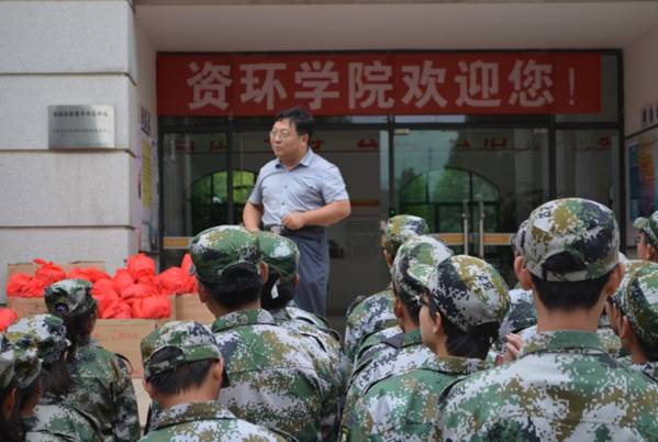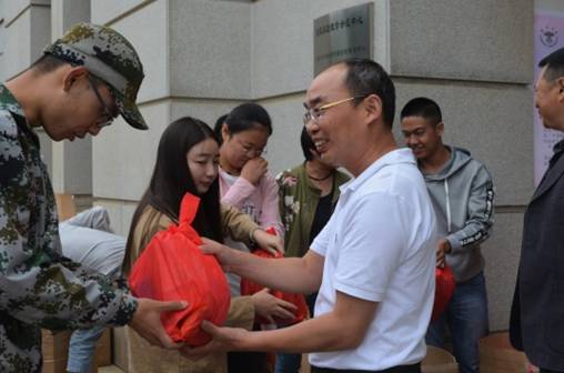 9月7日下午17点,在资环公司门口,2018级新生集结完毕,公司领导统一发放慰问品慰问新生。参与慰问的老师有:经理谈树成老师,公司党委副书记夏既胜老师,院团委书记韩雪老师及辅导员唐薇老师,新生辅导员夏雪老师。