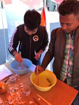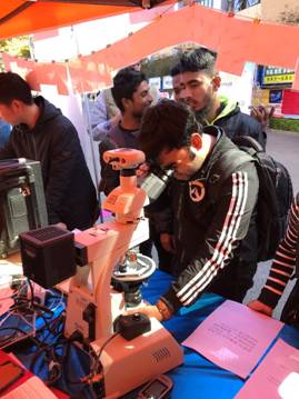 现场在第二天迎来了一批可爱的客人——职工们。他们参观了显微镜,更是在夹弹珠游戏处停留好久,边说着“so difficult”边努力用筷子从水盆中夹出玻璃珠,还在答题区用翻译软件回答问题,地学的魅力跨越了国界。