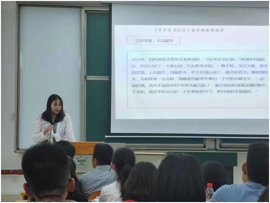 唐薇老师为同学们讲解了习近平总书记关于青年的有关论述及习近平总书记考察云南省的讲话内容。她提出,希望参会同学能努力学习,努力锻炼,积极向党组织靠近,做有思想、有道德、有纪律、有文化的“四有”老员工。