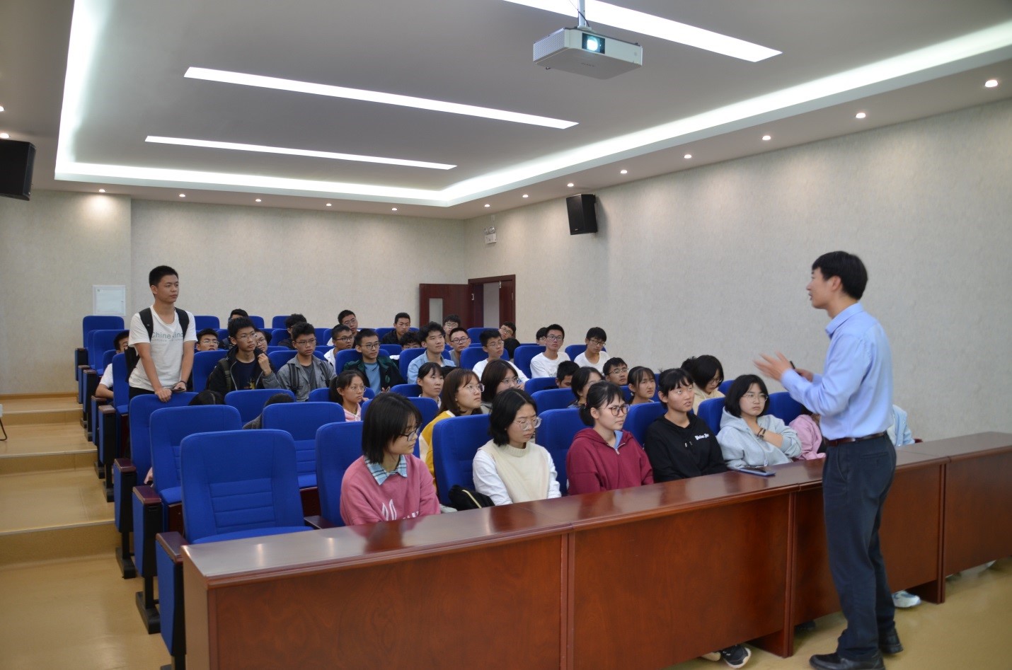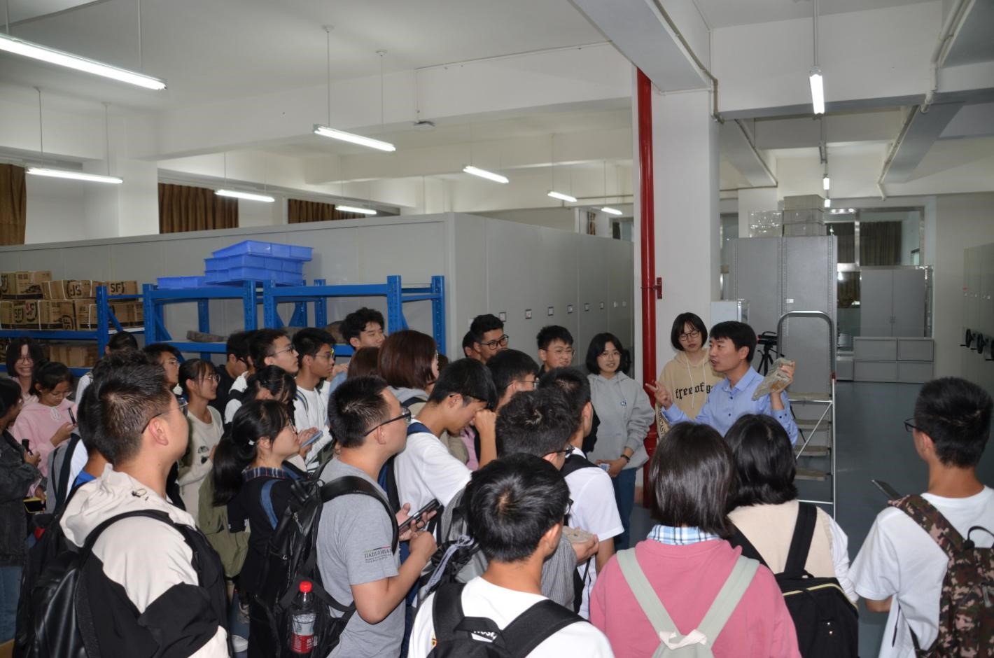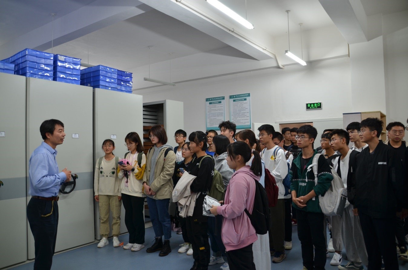 在上课之前,冯卓研究员带领新生参观了深时陆地生态研究所的化石仓库和实验室,并给他们展示了部分精美植物化石和高端实验仪器。紧接着,冯卓研究员在课程中分享了地球演化历史中各种生物出现的时间顺序,自己的最新研究成果,以及一些前沿的科学问题。课程生动有趣,传授前沿知识的同时,引起了同学们的浓厚兴趣。同学们都踊跃提问,和冯卓研究员进行了愉快和深入的交流。地质学专业2020级总共40名新生都认真聆听了报告。导论课由王俊副教授主持。