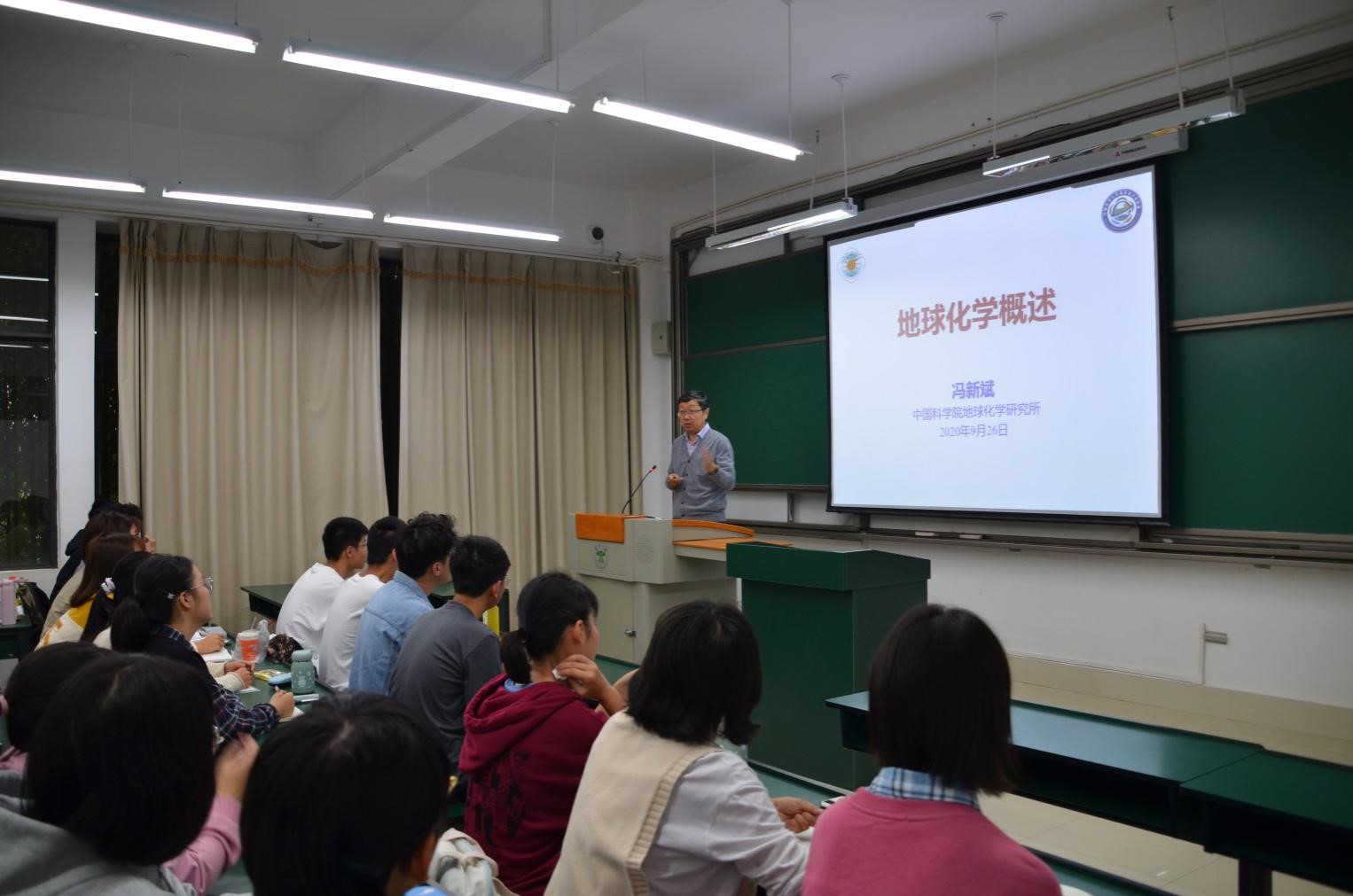 2020年9月27日上午,应公司经理谈树成教授和地质系主任刘铮副教授的邀请,中国科公司地球化学研究所所长冯新斌研究员在力行楼4309为地质学专业2020级新生上了两节题为《地球化学概述》的地质学前沿导论课。在课程中,冯新斌研究员介绍了地球化学的研究概况,中国科公司地球化学研究所的概况以及未来的发展规划等,并给在场的新生分享了一些前沿的科学问题。课程浅显易懂,生动有趣,员工们都踊跃提问,和冯新斌研究员进行了积极的交流。
