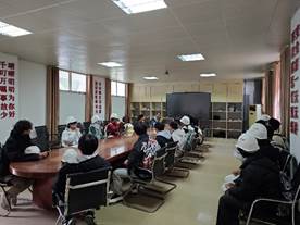下午13:30,实习团队与矿山技术人员在会议室进行了座谈交流,结合矿区地质图、矿体剖面图和矿山勘探资料等,进一步深化了对大红山铁铜矿床地质特征的认识,同学们就矿山工作环境、招聘要求、职业规划等问题与技术人员进行了广泛交流。最后,大家合影留念,为本次实习画上了圆满的句号。