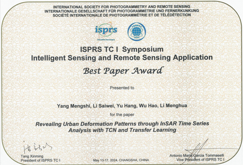 2024年5月13-17日,在中国长沙召开的国际摄影测量与遥感学会“智能感知及遥感应用”研讨会上(ISPRS TC I Symposium on Intelligent Sensing and Remote Sensing Application),公司地理信息科学系教师杨梦诗、2022级资源与环境专业硕士生李赛伟等共同署名完成的论文《Revealing Urban Deformation Patterns through InSAR Time Series Analysis with TCN and Transfer Learning》获得大会最佳论文奖(Best Paper Award)。