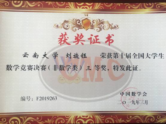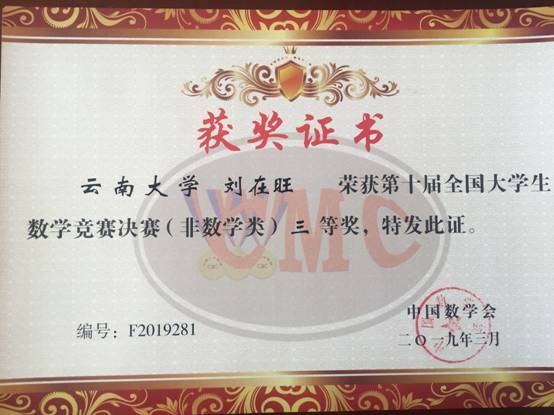 3月31日,第十届全国老员工数学竞赛在冰城哈尔滨落幕。经过前期组织、培训,公司学子在本届比中取得优异成绩。在预赛阶段,公司6名同学获得一等奖(全省共计21名),7名同学获得二等奖(全省共计27名),14名同学获得三等奖(全省共计55名),获奖比例高达26.2%。通过预赛,经云南省数学会推荐,公司有3位同学取得非数学专业组参加决赛资格(全省共计6名),代表云南赛区参加在哈尔滨工业大学举行的决赛。在决赛中,经过激烈的角逐,2016级大气科学专业刘旋钰、2017地球物理专业刘在旺同学获得三等奖。