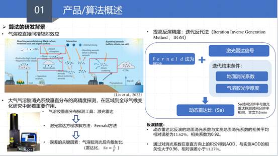 此次获奖作品,提出了一种新的确定动态激光雷达比的方法,称为迭代反代法(IIGM)。迭代反代法以Fernald法为基础,基于气溶胶垂直分布选取对应不同循环迭代约束,结合激光雷达信号可反演得到本地实时动态雷达比。动态雷达比反演的地面消光系数与实测地面消光系数的相关平均相对误差为11.62%,相关系数为0.92。通过对消光系数在垂直方向上的积分得到AOD,与实测AOD的相关性大于0.96,相对误差小于11.27%。