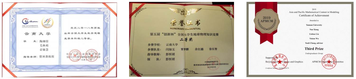 大气科学系教师多人获得教学比赛奖项。近几年,获全国高校青年教师教学竞赛理科组三等奖1人,教育报大气科学专业类指导委员会青年教师教学竞赛一等奖1人,三等奖2人,云南省高校教师教学大赛二等奖1人,三等奖1人,伟德bv1946教师课堂教学比赛一等奖3人。云南省数学竞赛优秀指导教师2人,云南省数学建模优秀指导教师3人。