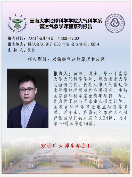 雷达气象学课程于2023年春季学期开展了“科教融合”课程系列报告,分别邀请了南京大学黄浩老师和国防科技大学胡明宝教授就双偏振雷达、相控阵天气雷达进行了线上专题讲座,参会师生均反映收获颇丰、受益匪浅。