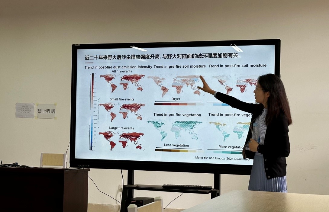 俞妍深入浅出的精彩报告赢得了现场热烈的掌声,随后,她与师生们就全球变暖背景下野火事件的变化等相关问题进行了深入交流和积极讨论。此次报告加深了与会者对野火发生发展机理和野火影响陆面沙尘事件的理解,为本系从事相关研究的师生提供了交流机会,为未来相关领域的研究提供了新的视角和思路。