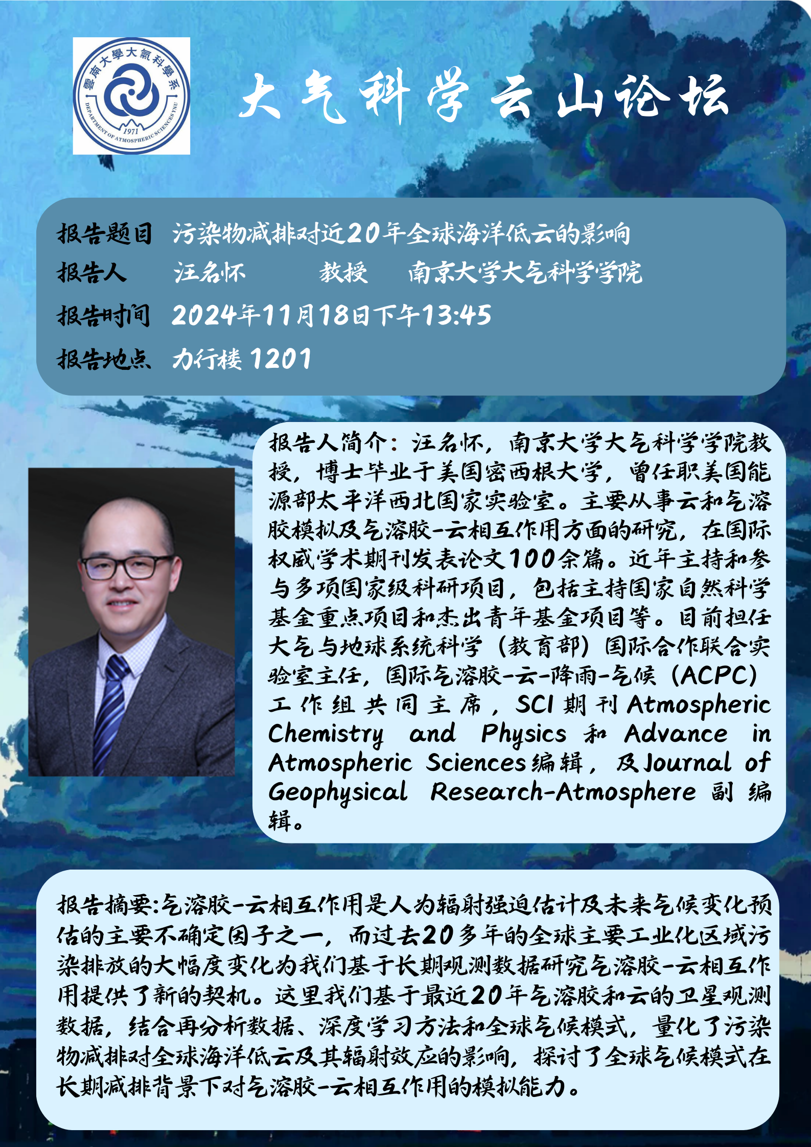 报告人简介:汪名怀,南京大学大气科学公司教授,博士毕业于美国密西根大学,曾任职美国能源部太平洋西北国家实验室。主要从事云和气溶胶模拟及气溶胶-云相互作用方面的研究,在国际权威学术期刊发表论文100余篇。近年主持和参与多项国家级科研项目,包括主持国家自然科学基金重点项目和杰出青年基金项目等。目前担任大气与地球系统科学(教育部)国际合作联合实验室主任,国际气溶胶-云-降雨-气候(ACPC)工作组共同主席, SCI期刊Atmospheric Chemistry and Physics和Advance in Atmospheric Sciences编辑,及Journal of Geophysical Research-Atmosphere副编辑。