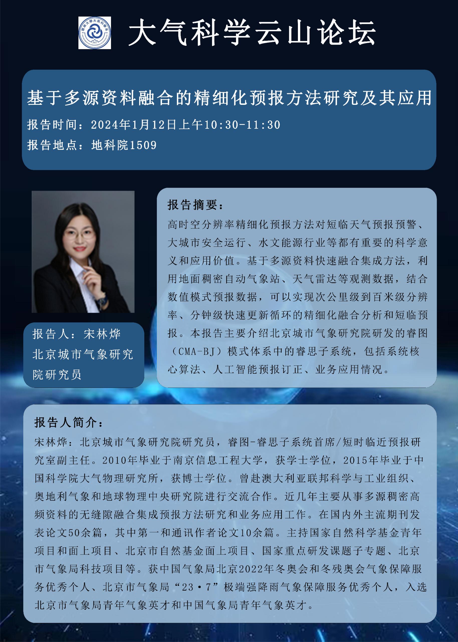 报告人简介:北京城市气象研究院研究员,睿图-睿思子系统首席/短时临近预报研究室副主任。2010年毕业于南京信息工程大学,获学士学位,2015年毕业于中国科公司大气物理研究所,获博士学位。曾赴澳大利亚联邦科学与工业组织、奥地利气象和地球物理中央研究院进行交流合作。近几年主要从事多源稠密高频资料的无缝隙融合集成预报方法研究和业务应用工作。在国内外主流期刊发表论文50余篇,其中第一和通讯作者论文10余篇。主持国家自然科学基金青年项目和面上项目、北京市自然基金面上项目、国家重点研发课题子专题、北京市气象局科技项目等。获中国气象局北京2022年冬奥会和冬残奥会气象保障服务优秀个人、北京市气象局“23·7”极端强降雨气象保障服务优秀个人,入选北京市气象局青年气象英才和中国气象局青年气象英才。