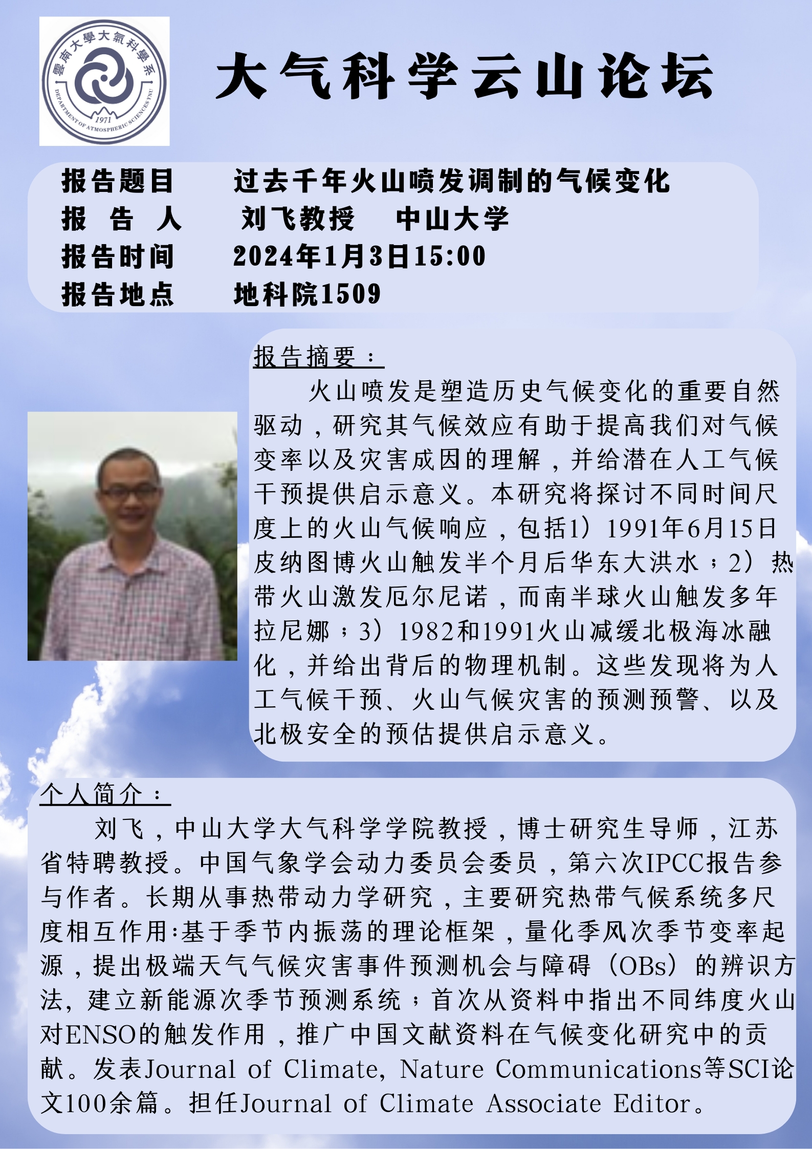 报告人简介:刘飞,中山大学大气科学公司教授,博士研究生导师,江苏省特聘教授。中国气象学会动力委员会委员,第六次IPCC报告参与作者。长期从事热带动力学研究,主要研究热带气候系统多尺度相互作用:基于季节内振荡的理论框架,量化季风次季节变率起源,提出极端天气气候灾害事件预测机会与障碍(OBs)的辨识方法,建立新能源次季节预测系统;首次从资料中指出不同纬度火山对ENSO的触发作用,推广中国文献资料在气候变化研究中的贡献。发表Journal of Climate, Nature Communications等SCI论文100余篇。担任Journal of Climate Associate Editor。