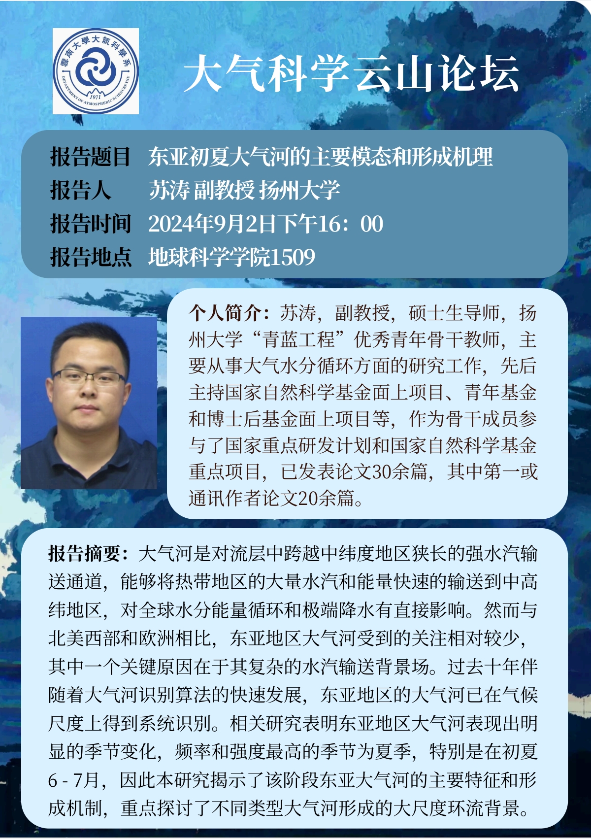 报告人简介:苏涛,副教授,硕士生导师,扬州大学“青蓝工程”优秀青年骨干教师,主要从事大气水分循环方面的研究工作,先后主持国家自然科学基金面上项目、青年基金和博士后基金面上项目等,作为骨干成员参与了国家重点研发计划和国家自然科学基金重点项目,已发表论文30余篇,其中第一或通讯作者论文20余篇。