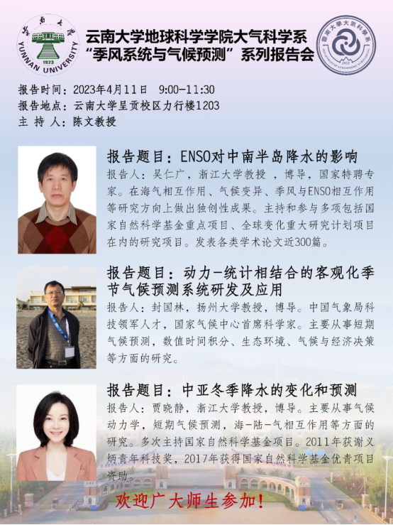 气候变化具有高度的复杂性。研究季风气候,一个目的是分析人类活动和自然变化对气候到底有多大影响,另一个重要目的是预测气候,评估气候变化对我们的影响。研究东亚季风的变化,对我们预测未来几十年的气候变化是至关重要的。三位学者将分别从《ENSO对中南半岛降水的影响》,《动力统计相结合的客观化季节气候预测系统研发及应用》及《中亚冬季降水的变化和预测》三个方面为我们介绍季风系统与气候预测领域的前沿进展。