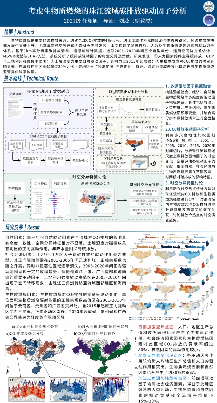 摘要:生物质燃烧是重要的碳排放来源,约占全球CO2排放的4%–5%。珠江流域作为我国经济与生态关键区,其碳排放在快速发展中显著上升,尤其滇黔桂交界已成为森林火灾频发区。本文构建了涵盖自然、人为及生物质燃烧等因素的驱动因子体系,基于1km高分辨率碳排放清单、遥感与统计数据,选取2001–2020年间五个典型年份,运用空间协方差估计、MGWR模型与SHAP方法,系统分析了碳排放驱动因子的时空分异及贡献。研究发现:①人为因素始终主导碳排放,GDP与土地利用强度影响显著;②土壤湿度为主要自然驱动因子,影响力自2015年起增强;③生物质燃烧对CO2排放的时空影响显著,在滇黔桂地区贡献超过30%;④上游地区呈“经济扩张–生态退化”特征。结果为流域差异化碳治理与生物质燃烧监管提供科学依据。