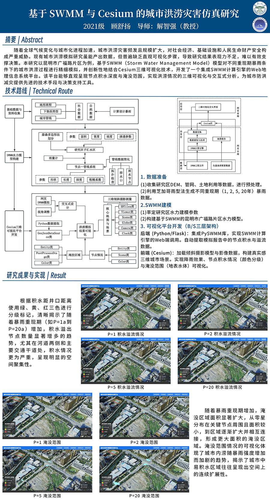 摘要:随着全球气候变化与城市化进程加速,城市洪涝灾害频发且规模扩大,对社会经济、基础设施和人民生命财产安全构成严重威胁。现有城市洪涝模拟研究虽能产出数据,但普遍缺乏直观可视化步骤,导致研究结果表现力不足,难以有效支撑决策。本研究以昆明市广福路片区为例,基于SWMM(Storm Water Management Model)模型对不同重现期暴雨条件下的城市洪涝过程进行精细模拟,并创新性地结合Cesium三维可视化技术,开发了一个集成SWMM计算引擎的Web地理信息系统平台。该平台能够直观呈现节点积水深度与淹没范围,实现洪涝情况的三维可视化与交互式分析,为城市防洪减灾提供先进的技术手段与决策支持工具。